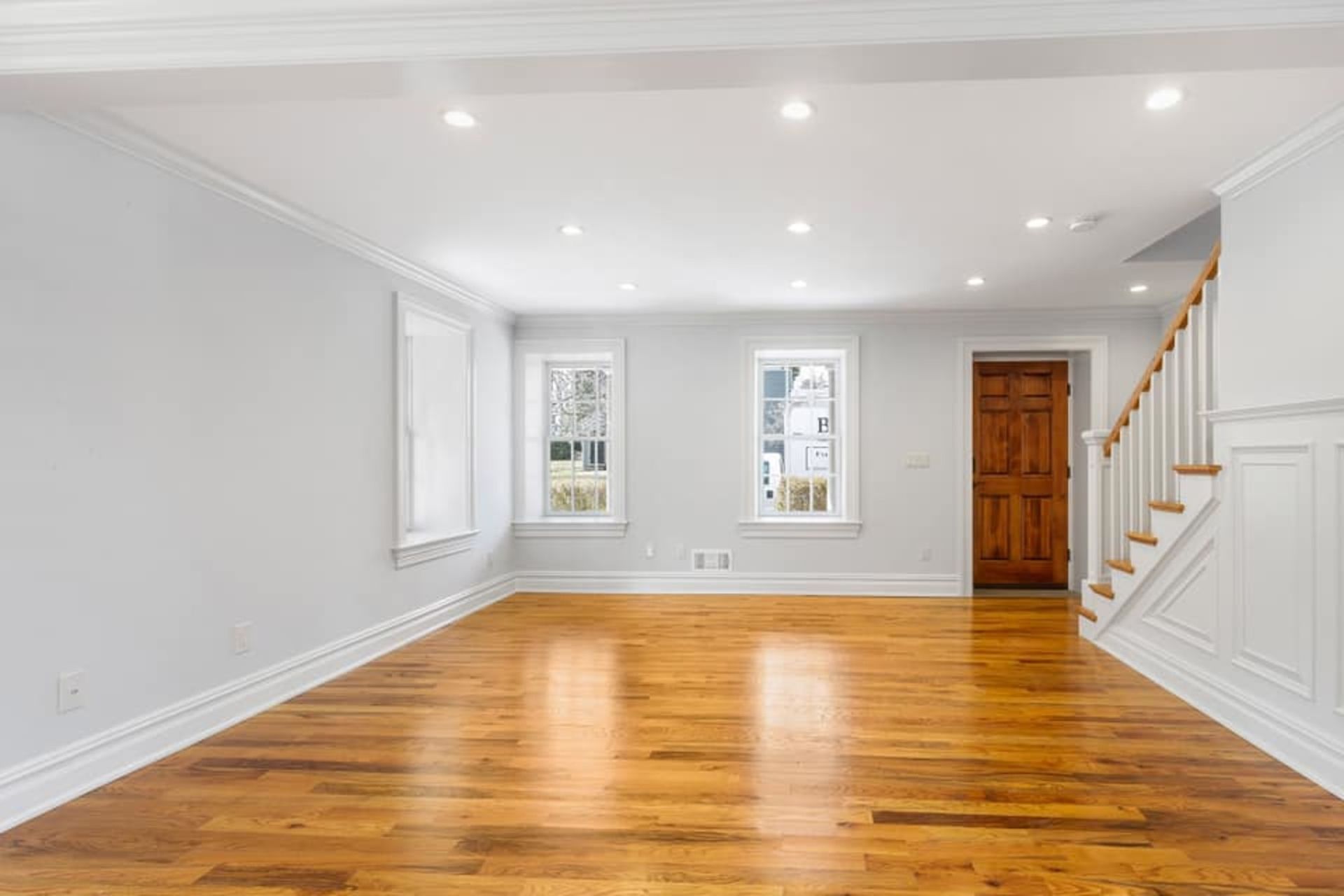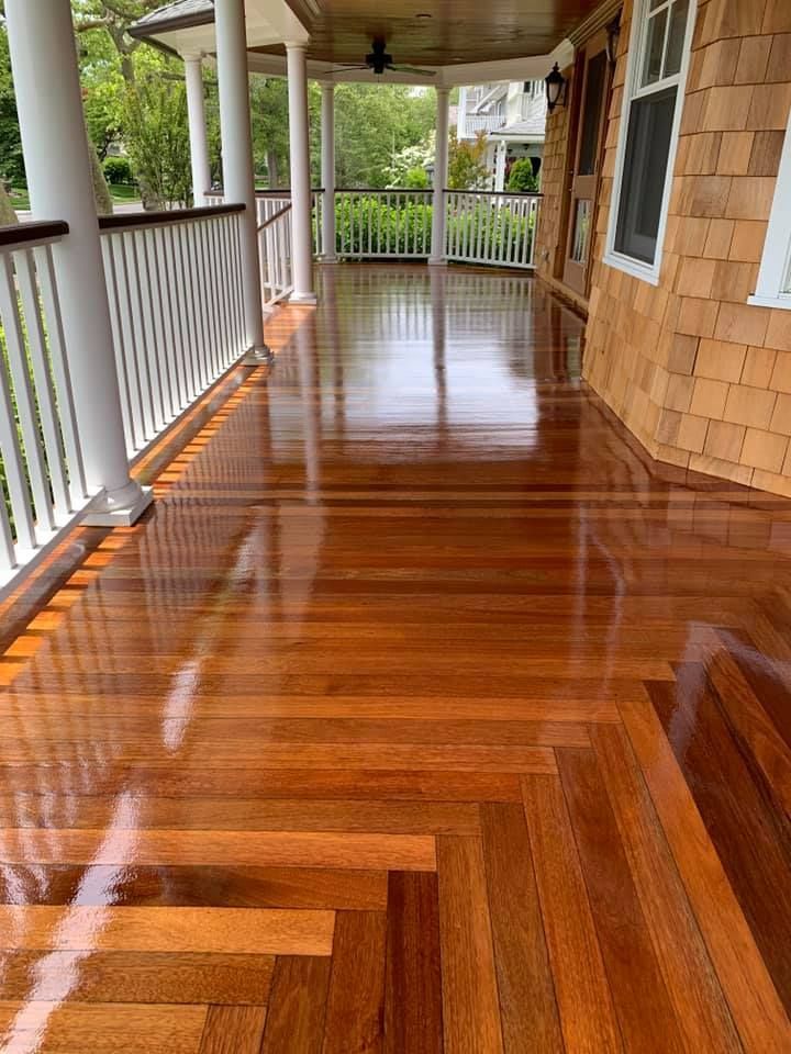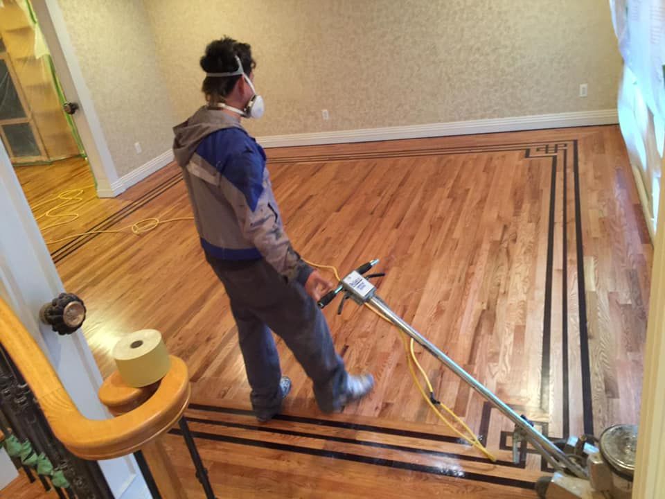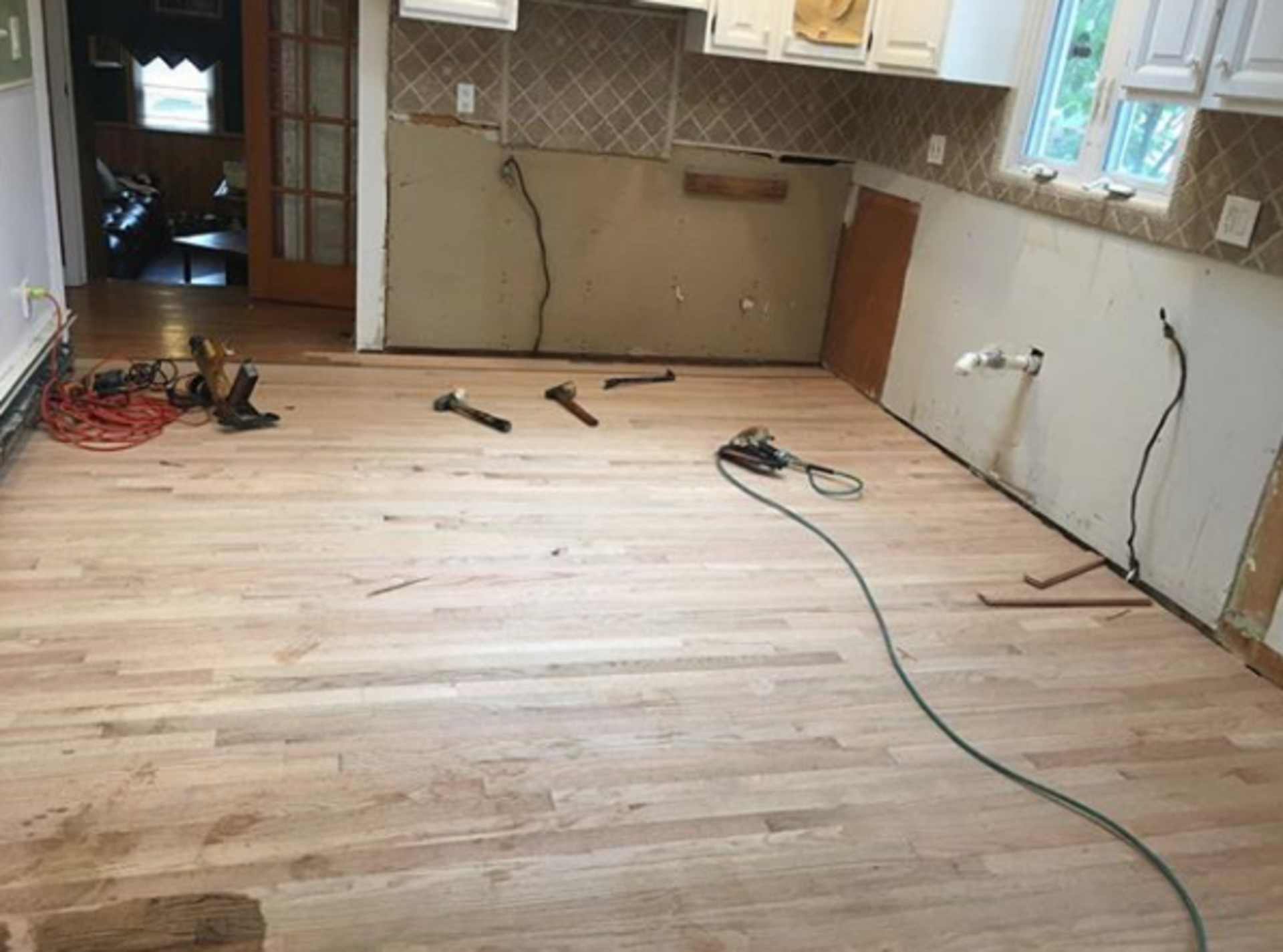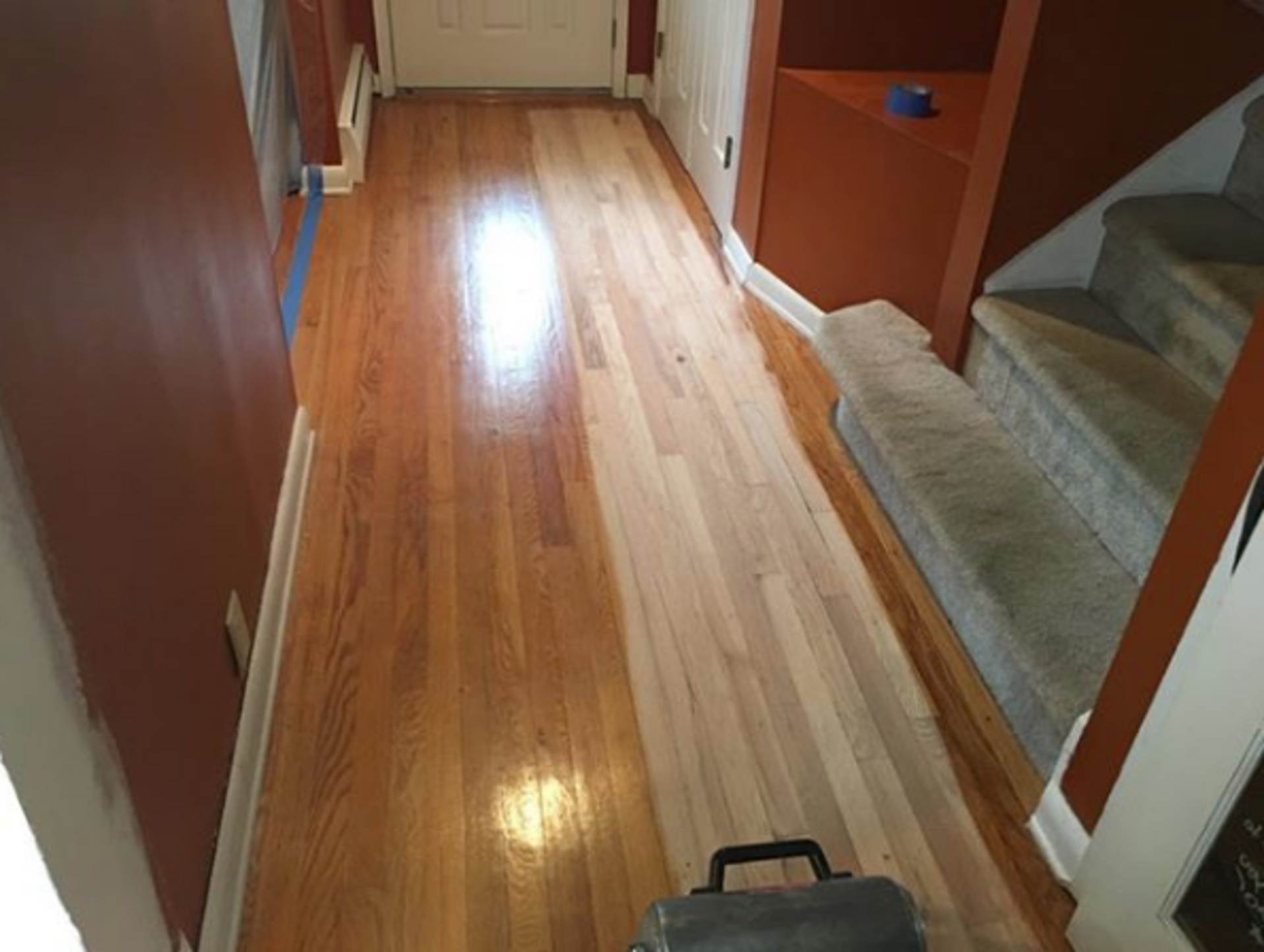 Removed old carpeting. Refinished hardwood floor underneath. Completed in one day. Early arrival. Very professional. Packaged old carpet for garbage. Provided plastic sheeting on all doorways leading off of the room being worked on. Sanded floors. Multiple layers of finish. Buffed finished floor. Very tidy.